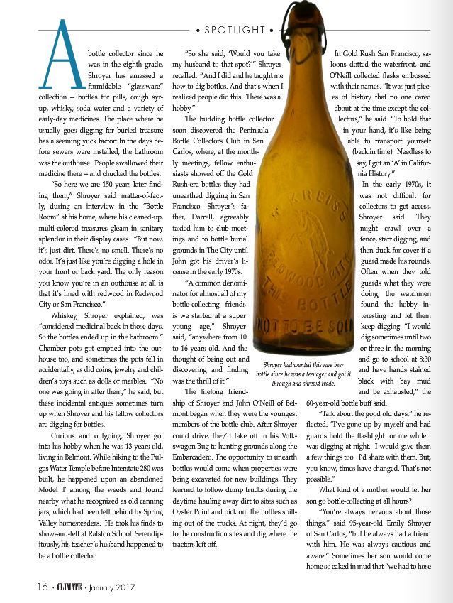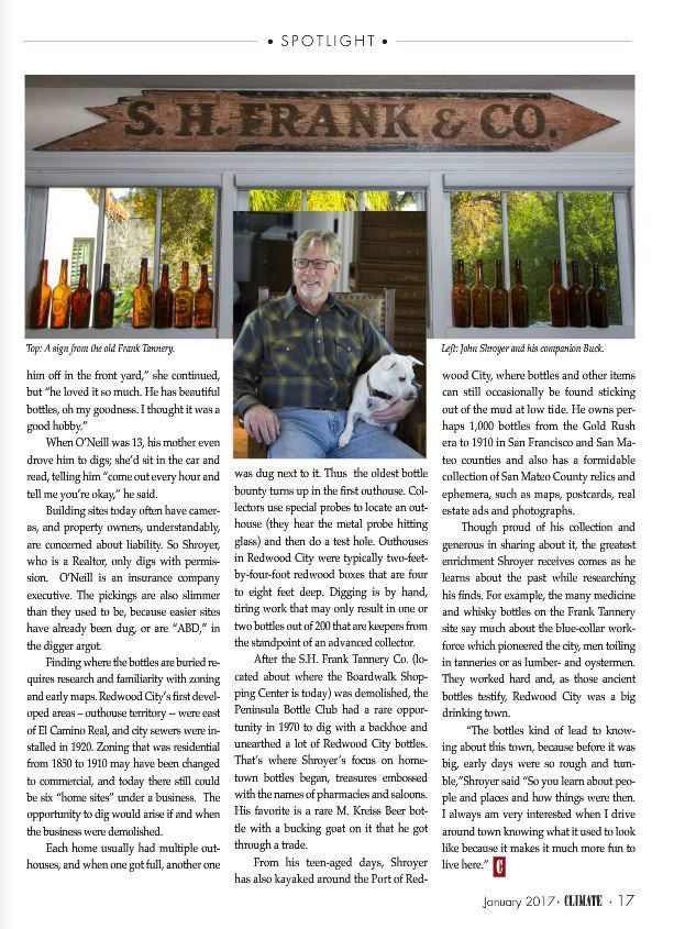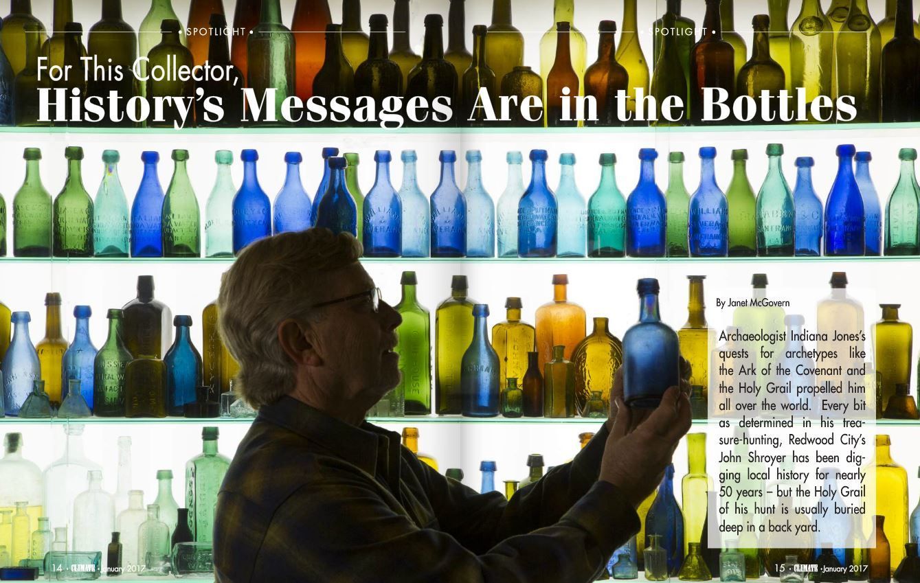 His longtime passion is bottle collecting, focusing on bottles from the local area. Did you know there was a dairy in San Carlos? Occasionally, he’ll have the chance to spend an afternoon in his kayak or digging behind an old house hunting for a great find.
